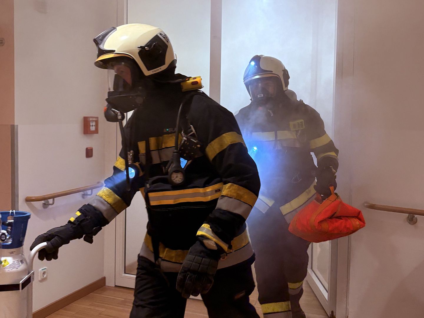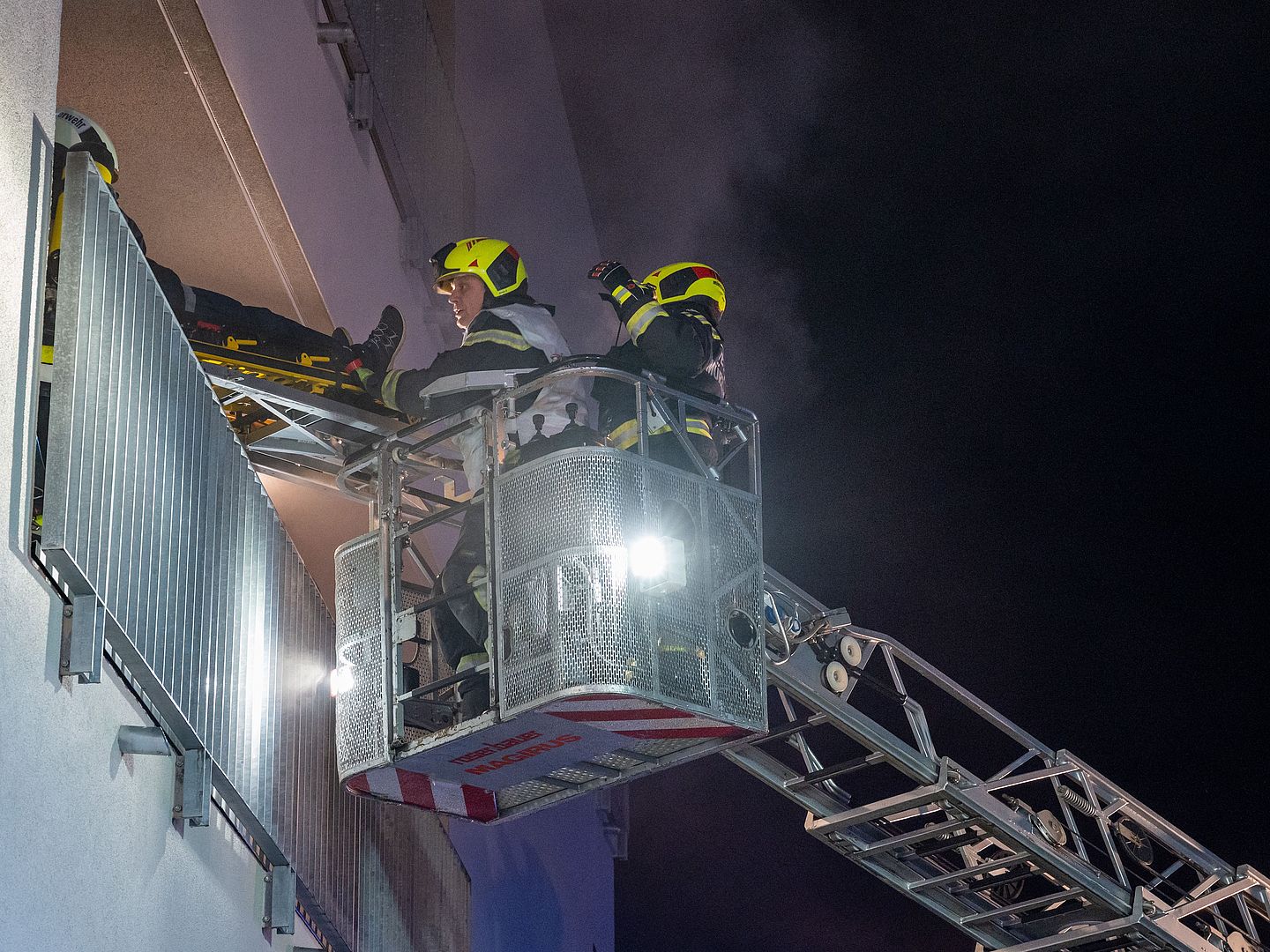 Das Übungsszenario sah eine starke Rauchentwicklung im Gangbereich auf Ebene 1 vor. Ziel war es, alle Bewohnerinnen und Bewohner – darunter auch mobilitätseingeschränkte Personen – rasch, geordnet und sicher zu evakuieren. Während sechs Bewohnerinnen und Bewohner intern in den nächsten Brandabschnitt gebracht wurden, erfolgte die Evakuierung eines weiteren Bewohners spektakulär über die Drehleiter der Feuerwehr.